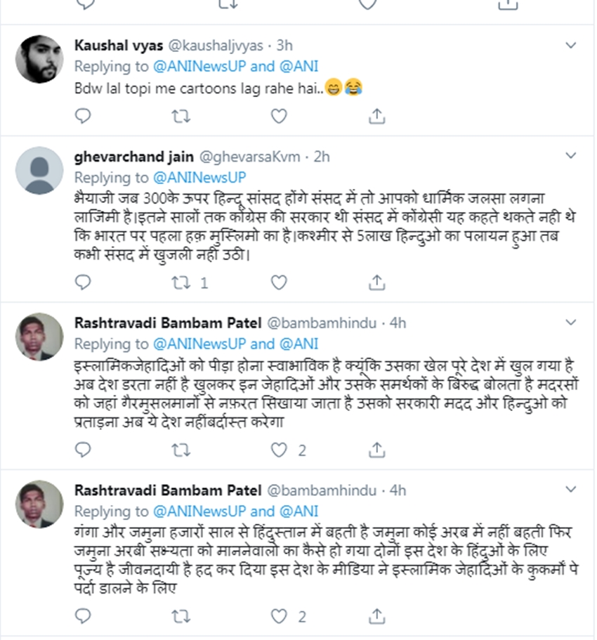 एक अन्य यूजर ने लिखा है- भैयाजी जब 300के ऊपर हिन्दू सांसद होंगे संसद में तो आपको धार्मिक जलसा लगना लाजिमी है।इतने सालों तक कोंग्रेस की सरकार थी संसद में कोंग्रेसी यह कहते थकते नही थे कि भारत पर पहला हक़ मुस्लिमो का है।कश्मीर से 5लाख हिन्दुओ का पलायन हुआ तब कभी संसद में खुजली नही उठी।