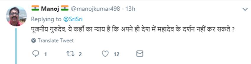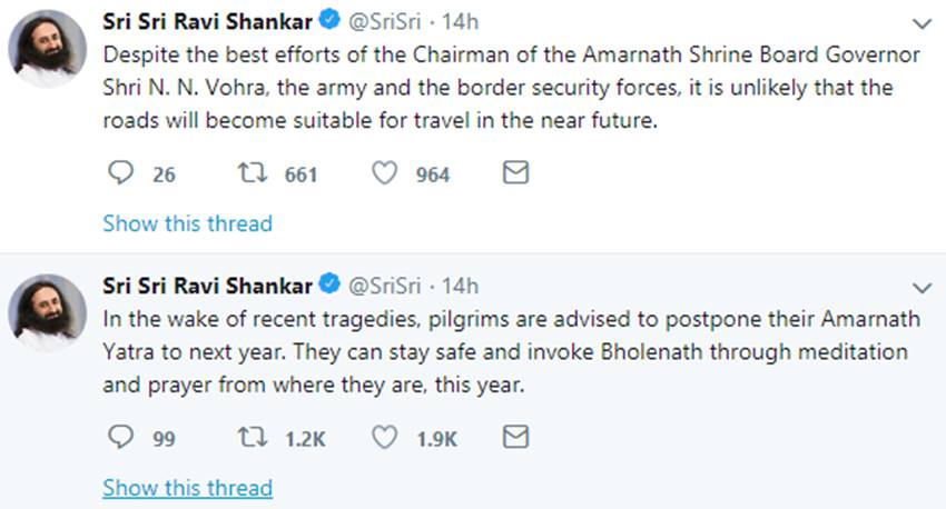श्री श्री ने मंगलवार (10 जुलाई) को एक ट्वीट किया। उन्होंने लिखा, “हाल की त्रासदियों को ध्यान में रखते हुए हमारी श्रद्धालुओं को सलाह है कि वे श्री अमरनाथ यात्रा अगले साल तक स्थगित कर दें। वे सुरक्षित रहें और इस साल अपने घरों से ही ध्यान और प्रार्थना के जरिए भोलेनाथ का आह्वान करें।”