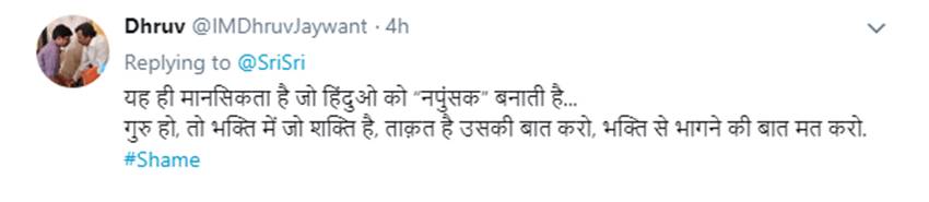 वीरम ने लिखा, “भक्तों का मनोबल न गिराएं।” ध्रुव नाम के हैंडल से कहा गया, “यही मानसिकता है, जो हिंदुओं को नपुंसक बनाती है। आप गुरु हो तो भक्ति की शक्ति की बात करो। भक्ति से भागने की बात न करो।”