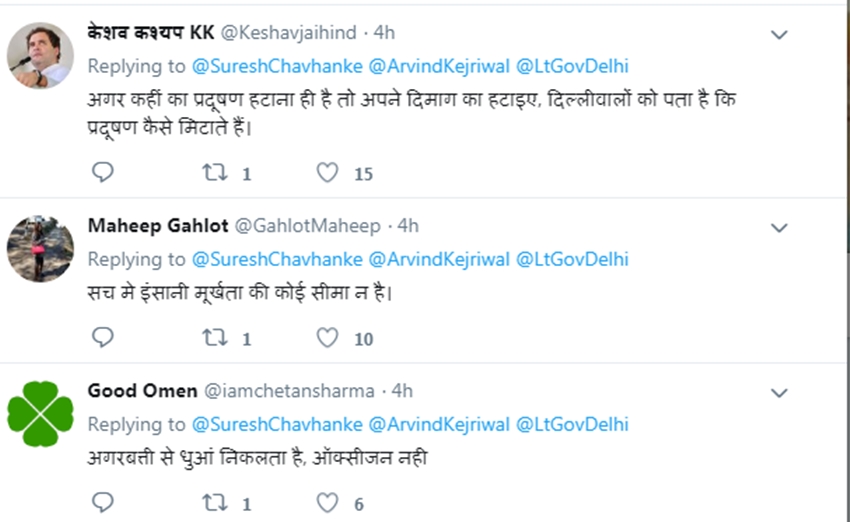एक यूजर ने लिखा है, अगर कहीं का प्रदूषण हटाना ही है तो अपने दिमाग का हटाइए, दिल्लीवालों को पता है कि प्रदूषण कैसे मिटाते हैं।एक अन्य यूजर ने लिखा है, अगरबत्ती से धुआं निकलता है, ऑक्सीजन नहीं। यूजर्स यहीं नहीं रुके एक अन्य यूजर ने सुरेश चव्हाणके का मजाक बनाते हुए लिखा- ये pollution अब सीधे इसके दिमाग मे असर कर दिया।