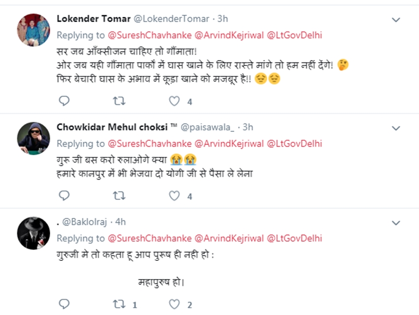 लोगों ने उनके ट्वीट पर उनका जमकर मजाक बनाया है। दरअसल चव्हाणके ने ट्वीट करते हुए लिखा,गैस चैंबर बनी दिल्ली को ऑक्सीजन से भर देगी गौमाता..सेव काऊ ट्रस्ट ने बनाया है पंचगव्य धूप, जो प्रदूषण को भगाएगा.. इसे आप ऑनलाइन ऑर्डर दे कर मंगा सकते हैं।उनके इस ट्वीट पर यूजर्स को उन्हें ट्रोल करने का मौका मिल गया।
