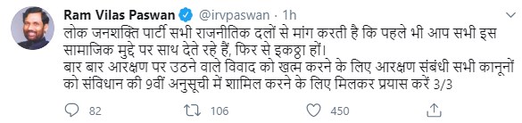 केन्द्रीय मंत्री ने लिखा कि “लोक जनशक्ति पार्टी सभी राजनीतिक दलों से मांग करती है कि पहले भी आप सभी इस सामाजिक मुद्दे पर साथ देते रहे हैं, फिर से इकट्ठा हों। बार-बार आरक्षण पर उठने वाले विवाद को खत्म करने के लिए आरक्षण संबंधी सभी कानूनों को संविधान की 9वीं अनुसूचि में शामिल करने के लिए मिलकर प्रयास करें।”