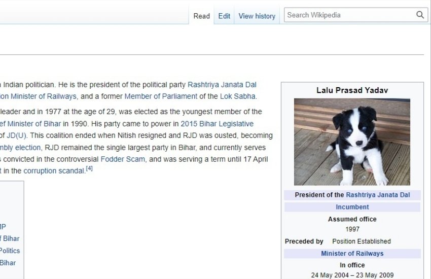 बिहार के पूर्व मुख्यमंत्री और राजद सुप्रीमो लालू प्रसाद यादव के विकिपीडिया पेज के साथ छेड़छाड़ की गई। विकिपीडिया पेज में लालू प्रसाद यादव की जगह कुत्ते की तस्वीर लगा दी गई। हालांकि कुछ ही समय के बाद इस गलती को सुधारते हुए फोटो को बदल दिया गया और फिर से लालू प्रसाद यादव की तस्वीर लगा दी गई।