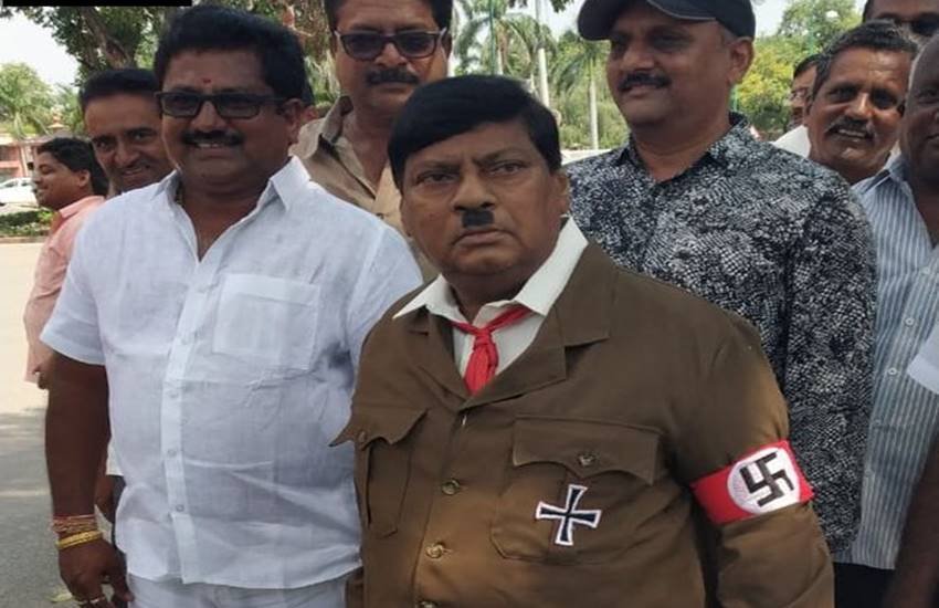 तेलुगूदेशम पार्टी के सांसद नरमल्ली शिवप्रसाद फिर से सुर्खियों में हैं। गुरुवार (9 अगस्त) को वह जर्मनी के तानाशाह अडाेल्फ हिटलर का भेष धारण करके संसद में आए थे। अभिनेता से राजनेता बने नरमल्ली शिवप्रसाद को भेष बदलकर विरोध करने के लिए जाना जाता है। इस बार उन्होंने अपनी मूंछों को हिटलर की तरह रखा हुआ था। इसके साथ ही उन्होंने भूरे रंग की शर्ट पहनकर कैमरों के सामने नाजी अंदाज में सैल्यूट भी किया।
