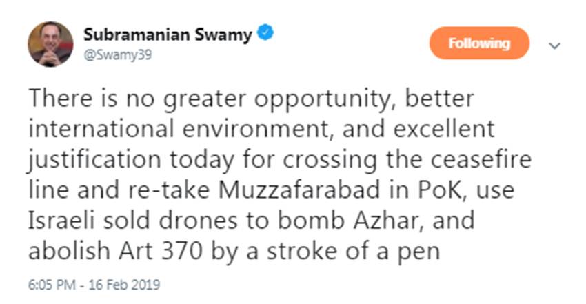 पुलवामा हमले को लेकर भारतीय जनता पार्टी (बीजेपी) के सांसद सुब्रमण्यम स्वामी ने कहा है कि भारत को इससे अच्छा मौका फिर कभी नहीं मिलेगा। देश की सेना और सुरक्षाबलों को इस दौरान पाकिस्तान अधिकृत कश्मीर (पीओके) में घुसकर मुजफ्फराबाद पर कब्जा कर लेना चाहिए। रविवार (16 फरवरी, 2019) को उन्होंने यह टिप्पणी सोशल मीडिया के जरिए की।