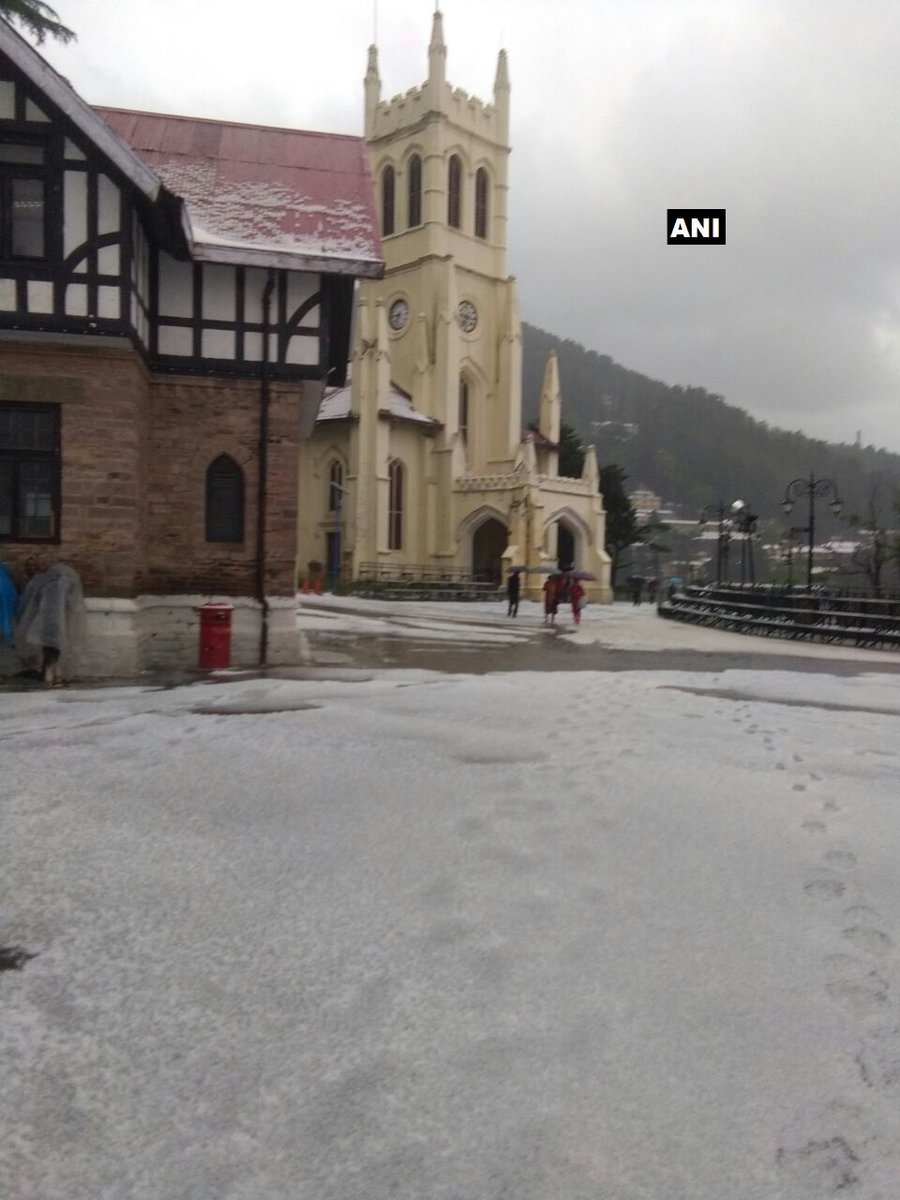 हिमाचल प्रदेश की राजधानी शिमला में मूसलाधार बारिश और ओलावृष्टि हुई। ऐसे में यहां की सड़कों पर सफेद रंग की बर्फ की चादर छा गई। मॉल रोड पर इसी कारण एंबुलेंस की आवागमन प्रभावित हुआ। वहीं, रिज मैदान भी पूरा बर्फ से ढंका नजर आया।