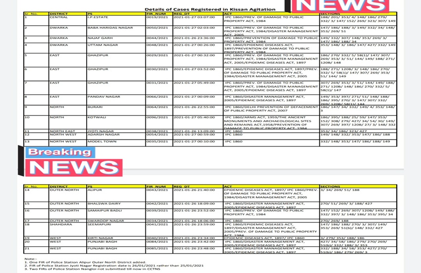 गणतंत्र दिवस पर किसान परेड के दौरान हुई हिंसा को लेकर योगेंद्र यादव और राकेश टिकैत समेत कई किसान नेताओं के खिलाफ केस दर्ज किए गए हैं।पुलिस ने सरवन सिंह पंढेर, सतनाम सिंह पन्नू के खिलाफ भी एफआईआर दर्ज की है। बता दें कि मामले में किसान नेता भी उन लोगों की पहचान कर रहे हैं जो कि हिंसा में शामिल थे। पुलिस ने मामले में साजिश रचे जाने का भी केस दर्ज किया है। बता दें कि एक फरवरी को किसानों ने संसद मार्च की भी योजना बनाई है।