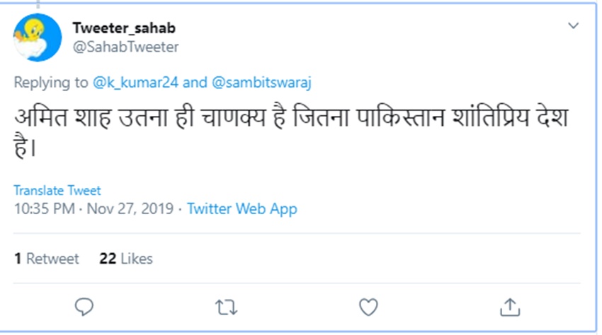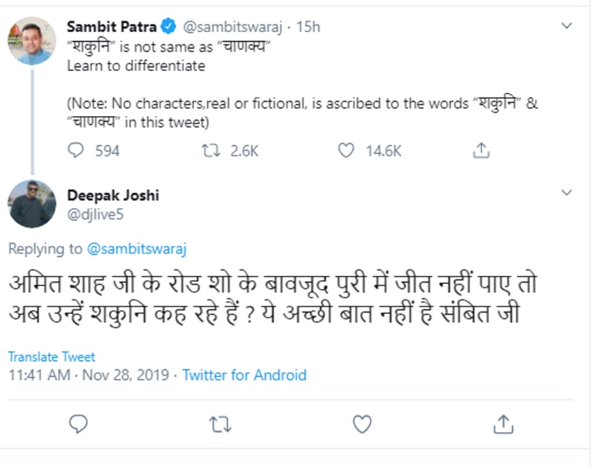 उनके इस ट्वीट पर कई यूजर्स ने अपनी प्रतिक्रियाएं दी हैं। दीपक जोशी ने लिखा कि ‘अमित शाह जी के रोड शो के बावजूद पुरी में जीत नहीं पाए तो अब उन्हें शकुनि कह रहे हैं ? ये अच्छी बात नहीं है संबित जी’…एक दूसरे यूजर ने इसपर अपनी प्रतिक्रिया देते हुए लिखा कि ‘अमित शाह उतना ही चाणक्य हैं जितना पाकिस्तान शांतिप्रिय देश है।’