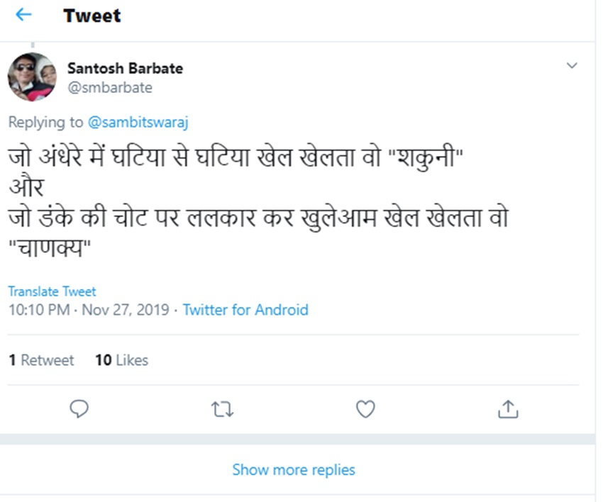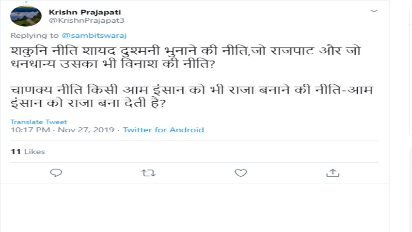 सतोष बारबते नाम के एक यूजर ने इसपर अपनी प्रतिक्रिया देते हुए लिखा कि ‘जो अंधेरे में घटिया से घटिया खेल खेलता है वो ‘शकुनी’ और जो डंके की चोट पर ललकार कर खुलेआम खेल खेलता है वो चाणक्य।’ कृष्ण प्रजापित नाम के एक यूजर ने लिखा कि ‘शकुनि नीति शायद दुश्मनी भुनाने की नीति,जो राजपाट और जो धनधान्य उसका भी विनाश की नीति? चाणक्य नीति किसी आम इंसान को भी राजा बनाने की नीति-आम इंसान को राजा बना देती है?’