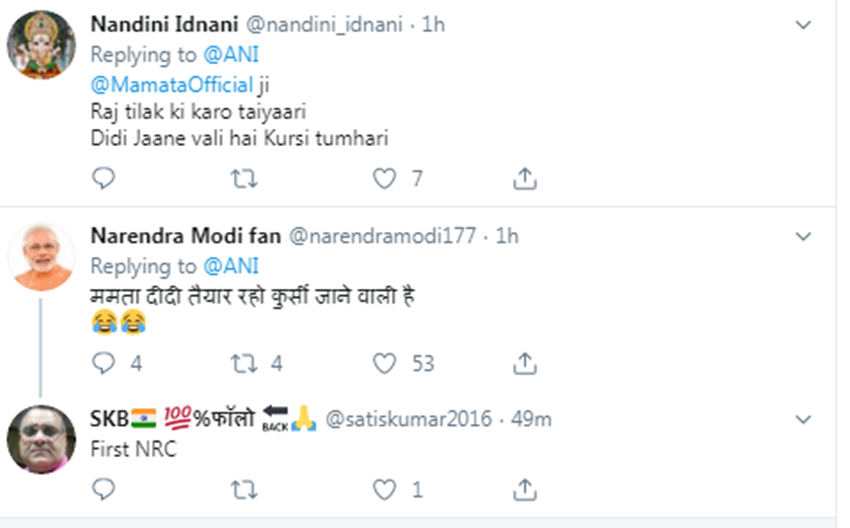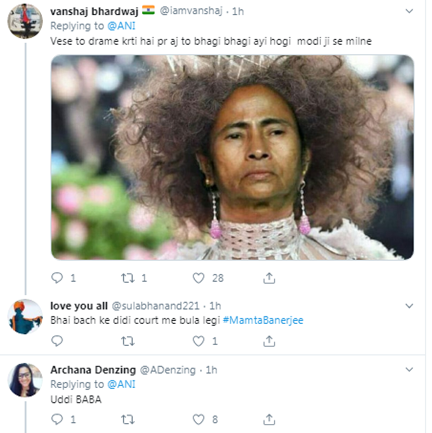 वंशराज भारद्वाज नाम के टि्वटर हैंडल से लिखा गया, “वैसे तो आप ड्रामे करती हैं, पर आज भागी-भागी आईं हैं मोदी जी से मिलने के लिए।” अर्चना डेंजिंग ने लिखा- हुड़ी बाबा…।