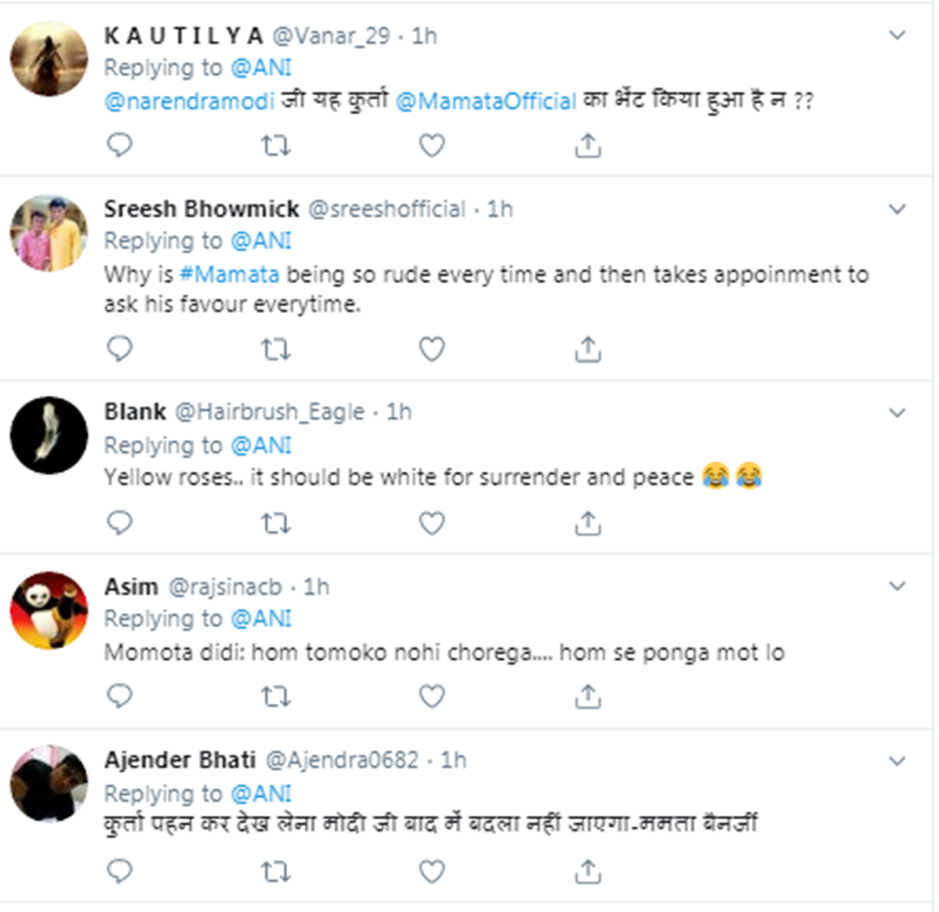 हालांकि, ममता-मोदी की इस मुलाकात पर सोशल मीडिया यूजर्स उनके मजे ले रहे हैं। लोगों ने टि्वटर पर लिखा, “कुर्ता पहनकर देख लीजिएगा मोदी जी। बाद में वह बदला नहीं जाएगा।” बता दें कि कुछ दिनों ममता ने पीएम मोदी को कुर्ता उपहारस्वरूप भेजा था।