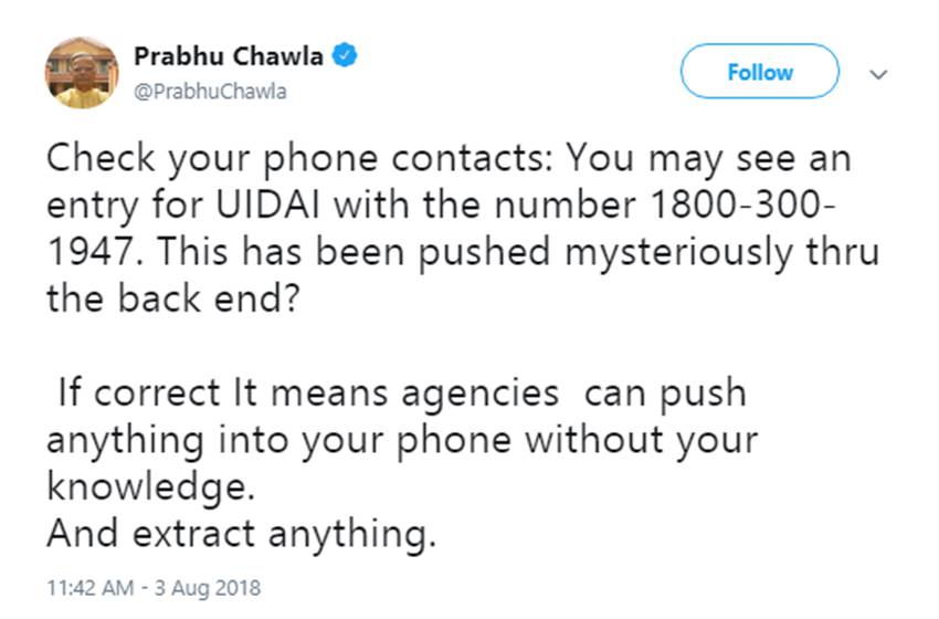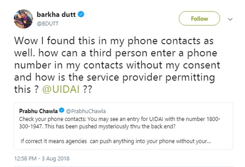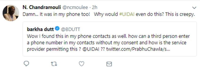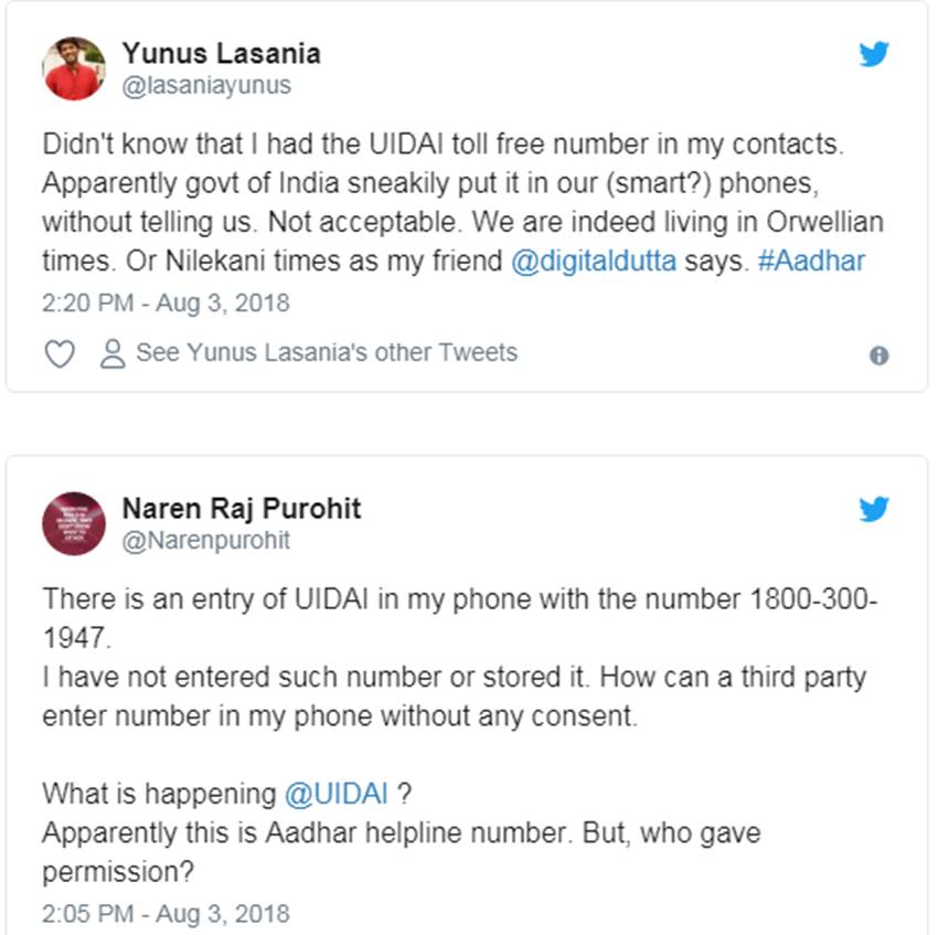 टि्वटर पर एक यूजर ने अपनी कॉन्टैक्ट लिस्ट का स्क्रीनशॉट अपलोड किया, जिसमें यूआईडीएआई का नंबर सेव दिखा रहा था। अन्य लोगों ने भी इस मसले पर शिकायत की और वे अपनी निजता की चिंता जताने लगे। लोग बोले कि ये नंबर उनके फोन में कहां से आया, उन्हें भी मालूम नहीं है। एजेंसियां अगर इस तरह ये नंबर लोगों के फोन में भेज सकती हैं, तो वह बाकी चीजें भी लोगों के फोन तक पहुंचा सकती हैं।