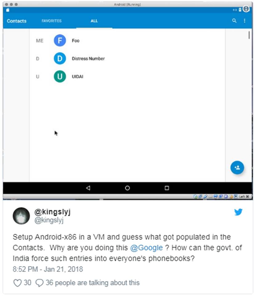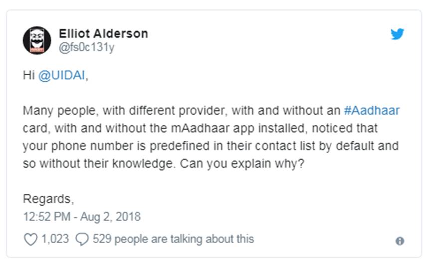 वहीं, फ्रेंच सिक्योरिटी एक्सपर्ट एलियॉट एंड्रसन ने टि्वटर पर यूआईडीएआई को टैग करते हुए पूछा, “विभिन्न कंपनियों के सिम इस्तेमाल करने वाले ढेर सारे लोगों ने पाया कि आपका फोन नंबर उनकी कॉन्टैक्ट लिस्ट में अपने आप आ गया। ऐसे लोगों के पास आधार कार्ड है भी और नहीं भी। उन्होंने एमआधार की ऐप्लीकेशन डाउनलोड की भी है और कुछ ने नहीं भी की है। ऐसे में उनके फोन में ये नंबर कैसे आया, आप यह बताएंगे?”