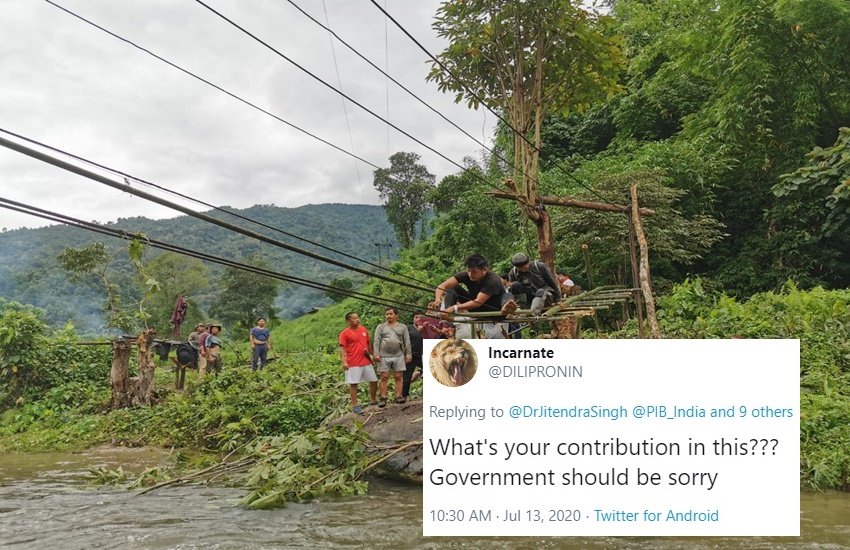 केंद्रीय मंत्री डॉक्टर जितेंद्र सिंह अपने एक ट्वीट के बाद सोशल मीडिया यूजर्स के निशाने पर गए हैं। दरअसल उन्होंने सोमवार (13 जुलाई, 2020) को ट्वीट कर कहा कि अरुणाचल प्रदेश में लॉकडाउन के बावजूद स्थानीय लोग ऊपरी सुबनसिरी जिले में जेब कोरो नदी पर पुल का निर्माण कर रहे हैं। सिंह ने ट्वीट के साथ तीन तस्वीरें शेयर करते हुए कहा, ‘लटकता पुल कुछ दिनों पहले बाढ़ के पानी में बह गया था।’