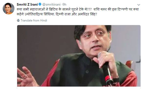 पद्मावती विवाद पर केन्द्रीय मंत्री स्मृति ईरानी ने कांग्रेस नेता शशि थरूर पर तंज कसा है। स्मृति ईरानी ने शशि थरूर को घेरने के लिए कांग्रेस नेताओं का ही सहारा लिया है। शशि थरूर ने कहा था कि फिल्म पद्मावती का विरोध कर रहे इन तथाकथित महाराजाओं ने ब्रिटिश राज के सामने घुटने टेक दिये थे। शशि थरूर ने कहा था कि ये राजा उस वक्त भाग खड़े हुए ब्रिटिश हुकूमत ने उनके मान सम्मान को रौंद दिया था। देश की पूर्व मानव संसाधन मंत्री स्मृति ईरानी ने सवाल उठाया है कि क्या अंग्रेजों के सामने सभी राजाओं ने घुटने टेक दिये थे। स्मृति ईरानी ने पूछा है कि थरूर की इस टिप्पणी पर राजपरिवार से आने वाले कांग्रेस के नेता ज्योतिरादित्य सिंधिया, दिग्विजय सिंह और पंजाब के सीएम कैप्टन अमरिंदर सिंह क्या कहेंगे। स्मृति ईरानी ने ट्वीट किया, ‘क्या सभी महाराजाओं ने ब्रिटिश के सामने घुटने टेके थे??? शशि थरूर की इस टिप्पणी पर क्या कहेंगे ज्योतिरादित्य सिंधिया, दिग्गी राजा और अमरिंदर सिंह?’