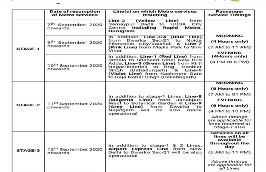 दूसरे चरण में ट्रेनें सुबह 7 बजे से दोपहर 1 बजे के बीच और शाम चार बजे से रात 10 बजे के बीच उपलब्ध रहेंगी। दूसरे चरण में 9 सितंबर को तीन अन्य लाइनों ब्लू लाइन, पिंक लाइन और गुड़गांव लाइन का संचालन शुरू होगा। दिल्ली मेट्रो रेल कॉर्पोरेशन के प्रमुख ने कहा कि ऑपरेशन और इसके प्रभाव को देखने के बाद, हम रेड लाइन (गाजियाबाद से रिठाला), बहादुरगढ़ लाइन और फरीदाबाद लाइन को 10 सितंबर से शुरू करेंगे। 12 सितंबर से सामान्य संचालन शुरू हो जाएगा।