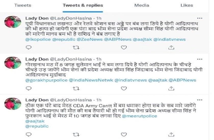 उत्तर प्रदेश विधानसभा चुनाव की सरगर्मी के बीच यूपी के सीएम योगी आदित्यनाथ समेत कई भाजपा नेताओं को बम से उड़ाने की धमकी दी गई है। बता दें कि लेडी डॉन नाम से बनाये गए एक ट्विटर अकाउंट से भाजपा के तमाम नेताओं की गाड़ियों को उड़ाने की धमकी दी गई है। साथ में हापुड़ पुलिस को भी टैग किया गया है। इसको लेकर मेरठ पुलिस ने ट्विटर को चिट्ठी लिखकर लेडी डॉन ग्रुप के बारे में जानकारी मांगी है।