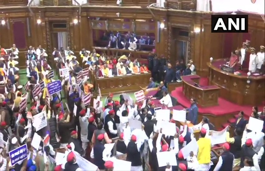 उत्तर प्रदेश विधानसभा में गुरुवार को जमकर हंगामा हुआ। विपक्षी पार्टियां सपा और बसपा के विधायकों ने सीएए, एनआरसी और सूबे में कानून व्यवस्था की स्थिति को लेकर नारेबाजी की। राज्यपाल आनंदी बेन पटेल को भाषण देने से रोका। हाथों में पोस्टर लेकर सरकार के खिलाफ विरोध जताया।