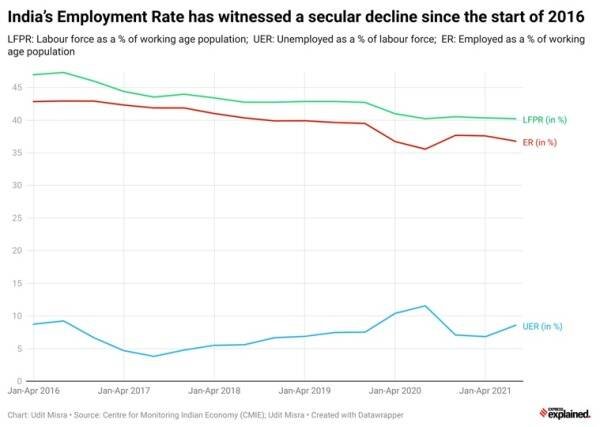 जब साल 2016 में नोटबंदी हु थी तब बेरोजगारी तेजी से बढ़ी थी। दिसंबर 2016 और अप्रैल 2017 के बीच एलएफपीआर 46 फीसदी से गिरकर 38 फीसदी हो गया था। इसी वजह से बेरोजगारी दर 16 फीसदी से घटकर 4 फीसदी पर आ गई थी। इसी तरह कोविड महामारी के दौरान भी लोग अपने-अपने गांव पहुंच गए और रोजगार की मांग कम कर दी।