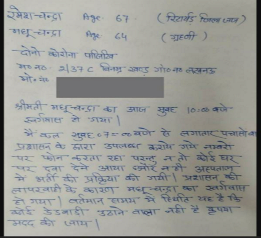 उत्तरप्रदेश के चरमराए स्वास्थ्य व्यवस्था की हकीकत बयां करते हुए रिटायर्ड जज ने एक चिट्ठी लिखी। इस चिट्ठी में लखनऊ के गोमती नगर में रहने वाले रिटायर्ड जज रमेश चंद्रा ने लिखा कि वह और उनकी पत्नी मधु चंद्रा दोनों कोरोना संक्रमित थे। अस्पताल में भर्ती होने को लेकर उन्होंने प्रशासन के अधिकारियों को कई बार फ़ोन किया लेकिन पांच मिनट कहकर तीन दिनों तक कोई भी उनके पास नहीं आया। ना तो दवाई उनके पास पहुंचाई गई और ना ही उन्हें अस्पताल में भर्ती कराया गया।