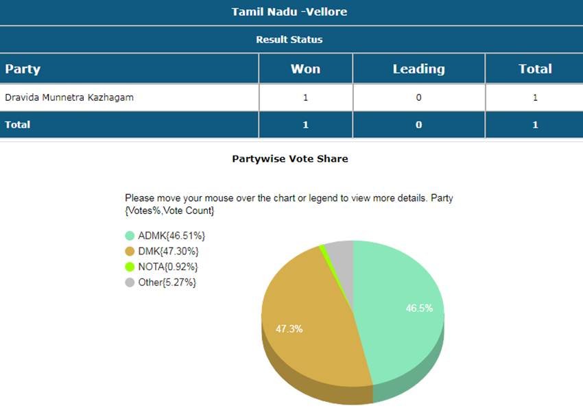 डीएमके के कठिर आनंद ने आठ हजार 141 वोटों के अंतर से चुनाव में जीत हासिल की है। वह वरिष्ठ नेता दुरई मुरुगन के बेटे हैं और उन्होंने एआईएडीएमके के एसी शानमुगम को मात दी है। हालांकि, एआईएडीएमके मतगणना के दौरान शुरुआत में आगे चल रही थी, पर पांचवें राउंड की गिनती के बाद डीएमके ने बढ़त ले ली।