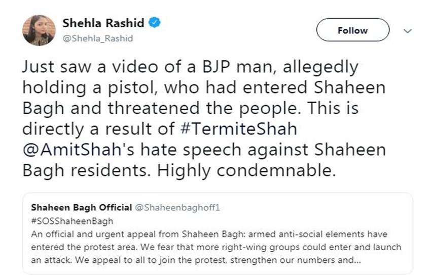 घटना पर जेएनयू की पूर्व छात्र नेता और एक्टिविस्ट शेहला राशिद ने बीजेपी को घेरने की कोशिश करते हुए इसे गृह मंत्री अमित शाह के बयान से जोड़ा है। शेहला ने ट्वीट कर कहा ‘बीजेपी के एक आदमी के कथित तौर पर शाहीन बाग में पिस्तौल लहराने का वीडियो देखा। वह लोगों को डराने की कोशिश कर रहा है। ये अमित शाह की ‘बदजुबानी’ का नतीजा है जिसका इस्तेमाल उन्होंने शाहीन बाग के निवासियों के खिलाफ किया है।’