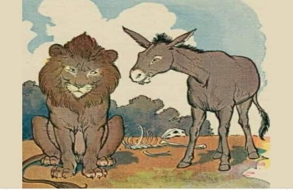 गधे ने कहा: बाघ मुझसे असहमत है और मेरा विरोध करता है और मुझे परेशान करता है। कृपया उसे दंडित करें”। तब शेर ने कहा: “बाघ को 5 साल के मौन की सजा दी जाएगी”। गधा खुशी से उछल पड़ा और अपने रास्ते पर चला गया और दोहराता रहा: “घास नीली है”…