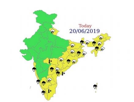 मौसम विभाग के मुताबिक गुरुवार (20 जून, 2019) को भारत दक्षिणी और उत्तरी-पूर्वी राज्यों में भारी बारिश हो सकती है। विभाग के मुताबिक केरल, दक्षिणी कर्नाटक, आंध्र प्रदेश के तटीय इलाके, गोवा और तेलंगाना में आज भारी बारिश होगी। वहीं पूर्वोत्तर में, असम, मेघालय, पश्चिम नागालैंड, मणिपुर, मिजोरम और त्रिपुरा के साथ-साथ पश्चिम बंगाल और ओडिशा में भी दिन नम रहेगा।