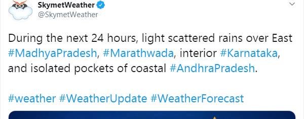 स्काईमेट वेदर के मुताबिक मध्यप्रदेश के पूर्वी क्षेत्र सहित महाराष्ट्र और कर्नाटक में अगले 24 घंटे के भीतर बारिश की संभावना है। वहीं आंध्रप्रदेश के तटीय इलकों में ऐसी संभावन बन रही है।