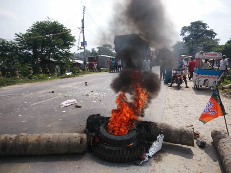 बंगाल में कुछ जगहों पर बंद समर्थकों ने बसों में तोड़फोड़ की। बाद में उनके टायर जलाकर रास्ता भी बाधित किया। (एक्सप्रेस फोटो)