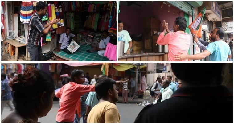 बीजेपी कार्यकर्ता ने हाथीबागान इलाके में हाथ जोड़-जोड़ कर दुकानदारों से दुकानें बंद करने की अपील की। (एक्सप्रेस फोटो)