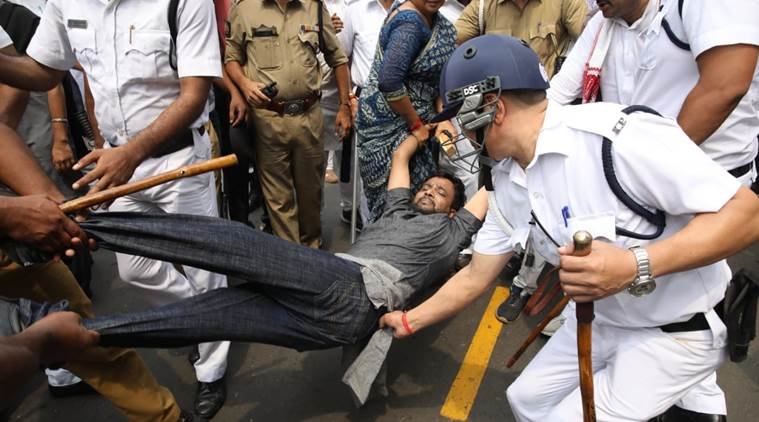 बीजेपी द्वारा बुलाए गए बंद के दौरान सेंट्रल एवेन्यू इलाके में सड़क जाम करने पर पुलिस ने कुछ इस तरह बीजेपी समर्थकों को गिरफ्तार किया। (एक्सप्रेस फोटोः पार्था पॉल)