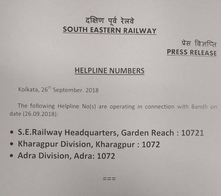 दक्षिणी पूर्वी रेलवे (एसईआर) के केंद्रीय जन संपकर्क अधिकारी संजॉय घोष ने बताया, "बीजेपी कार्यकर्ता बंद के दौरान एसईआर के हावड़ा-खड़गपुर सेक्शन में चेन्गेल, अंदुल और रामराजतला स्टेशंस से गुजरने वाली ट्रेनों का रास्ता रोका।"