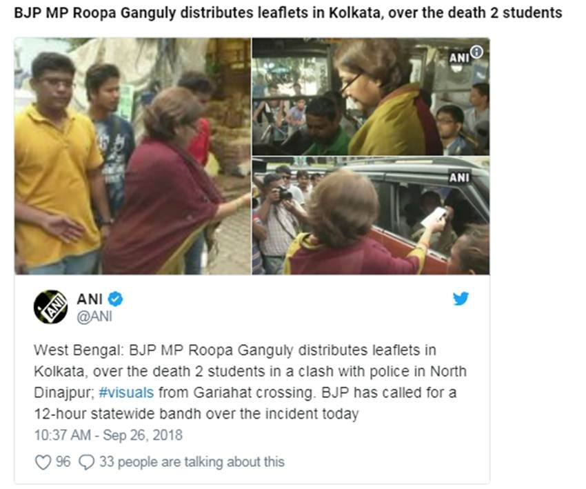 भारतीय जनता पार्टी (बीजेपी) नेता रूपा गांगुली प.बंगाल में बंद के बीच तृणमूल कांग्रेस और पुलिस पर बुरी तरह बरसी हैं। बुधवार को गरियाघाट में हुए विरोध प्रदर्शन के दौरान उन्होंने कहा, "बंद को हम दिल से मानते नहीं है। पर विरोधी राजनीतिक पार्टी ने, ममता जी ने हमारे सामने विकल्प क्या रखा है? पुलिस खड़ी होकर आपको मारेगी। छात्रों ने शिक्षक मांग की, अगर इस आधार पर उन्हें गोली मारी जाएगी और बीच सड़क पर लात मार-मार जान निकाली जाएगी, यह सही नहीं है।"