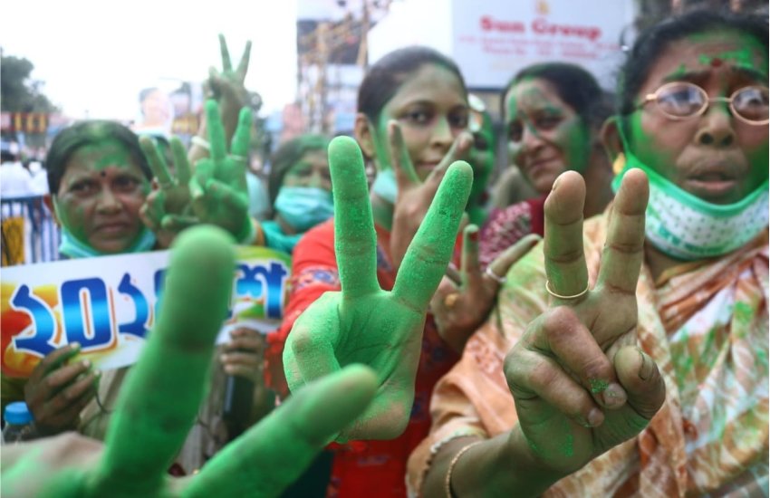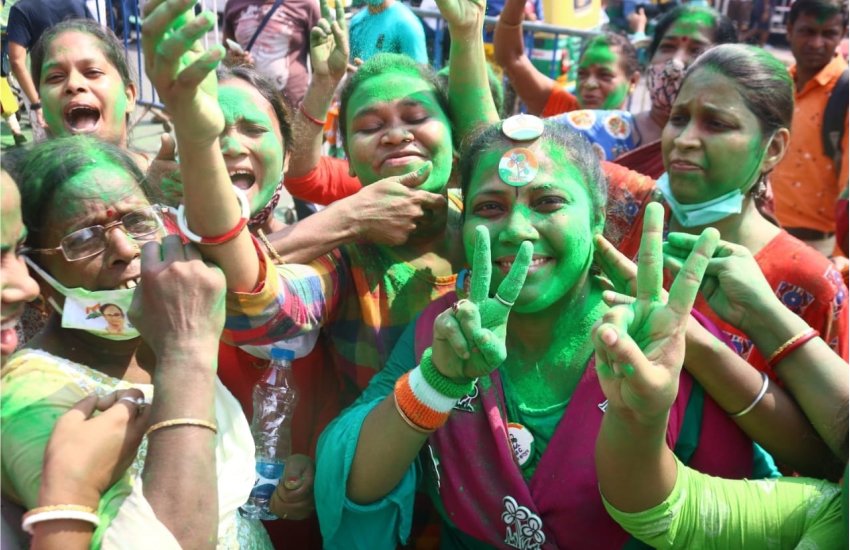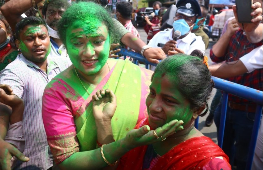 ममता बनर्जी के चुनाव जीतते ही कोलकाता में मुख्यमंत्री आवास के बाहर टीएमसी कार्यकर्ताओं ने जमकर जश्न मनाया। इस दौरान राज्य के अलग अलग कोने से आए टीएमसी कार्यकर्ताओं ने एक दूसरे को हरा गुलाल लगाकर जीत की बधाई दी।