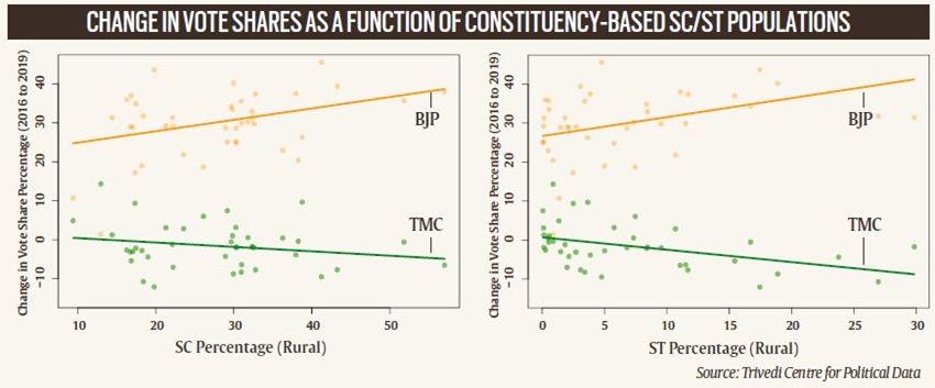 इसका स्पष्ट उदाहरण उन इलाकों में मिलता है, जहां एससी आबादी 17 फीसदी से कम है, वहां बीजेपी को 32 फीसदी वोट मिले लेकिन जहां एससी आबादी 32 फीसदी से ज्यादा है, वहां बीजेपी को 42 फीसदी से ज्यादा वोट मिले। इसी तरह जहां-जहां एसटी आबादी 0.5 फीसदी और उससे कम है, वहां बीजेपी को 37 फीसदी वोट मिले, जबकि जहां एसटी आबादी 11 फीसदी से ज्यादा है, वहां बीजेपी को 50 फीसदी वोट मिले। यानी स्पष्ट है कि एससी और एसटी समुदाय के लोगों ने इस बार बीजेपी को वोट दिया है। इसके पीछे के कारणों में ममता सरकार के खिलाफ रोष, धार्मिक ध्रुवीकरण और मोदी सरकार की योजनाओं का लाभ भी शामिल हो सकता है।