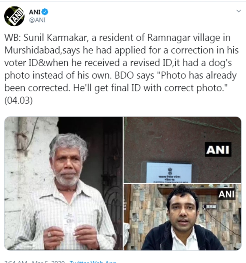 बंगाल में एक शख्स ने मतदाता पहचान पत्र में सुधार के लिए आवेदन किया था।जब नया मतदाता पहचान पत्र उस शख्स के पास पहुंचा तो वह चौंक गया। दरअसल, वोटर आईडी कार्ड में उसकी फोटो की जगह कुत्ते की तस्वीर लगी थी। न्यूज एजेंसी एनएनआई ने ट्विटर पर तस्वीर भी शेयर की है।
