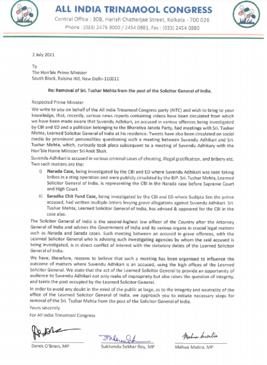 पश्चिम बंगाल में मुख्यमंत्री ममता बनर्जी के नेतृत्व वाली टीएमसी सांसदों ने पीएम को लिखे खत में सॉलिसिटर जनरल ऑफ इंडिया के पद से तुषार मेहता को हटाने की गुजारिश की है। टीएमसी के सांसदों ने मेहता और भाजपा नेता शुभेंदु अधिकारी के बीच हुई मुलाकात को “हितों का टकराव” करार दिया। पत्र में अधिकारी को विभिन्न आपराधिक मामलों में आरोपी बताया गया है।
