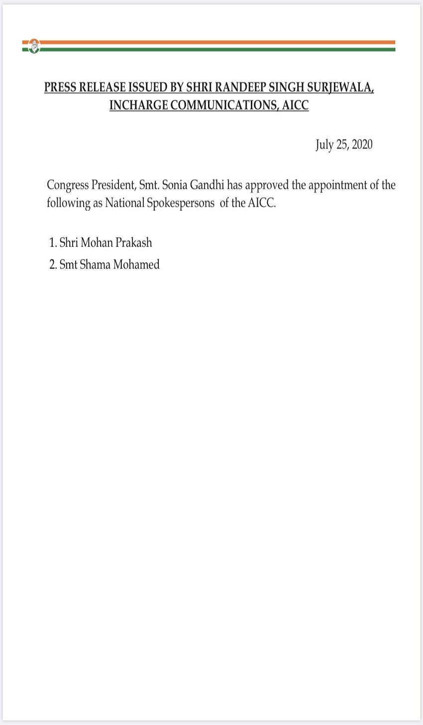 Congress ने शनिवार (25 जुलाई, 2020) को शमा मोहम्मद समेत दो लोगों को पार्टी का राष्ट्रीय प्रवक्ता नियुक्त किया है। शमा के साथ मोहन प्रकाश राष्ट्रीय प्रवक्ता बनाए गए हैं। कांग्रेस के मुख्य प्रवक्ता रणदीप सुरजेवाला की ओर से जारी बयान के मुताबिक, कांग्रेस अध्यक्ष सोनिया गांधी ने शमा और प्रकाश की नियुक्तियों को स्वीकृति दी है।