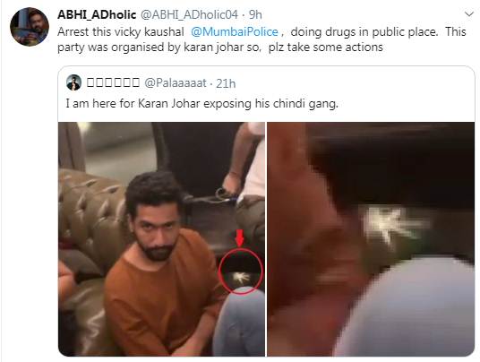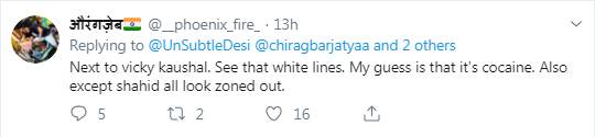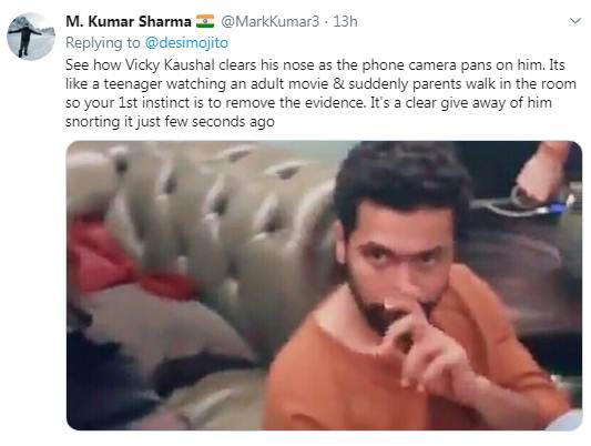इस पर सोशल मीडिया यूजर्स तरह के तरह के कमेंट कर रहे हैं और मीम्स बना रहे हैं। एक ट्वीट में विकी कौशल के पास दिखाई दे रहे सफेद पाउडर को लेकर सवाल खड़े कर रहे हैं। ऐसे अटकलें लगायी जा रही हैं कि वीडियो में दिखाई दे रही सफेद चीज ड्रग्स हो सकती है। हालांकि अभी तक ये सिर्फ अटकलें हैं। कुछ सोशल मीडिया यूजर्स ने तो मुंबई पुलिस को टैग करते हुए सितारों के खिलाफ कार्रवाई करने की भी मांग कर डाली।
