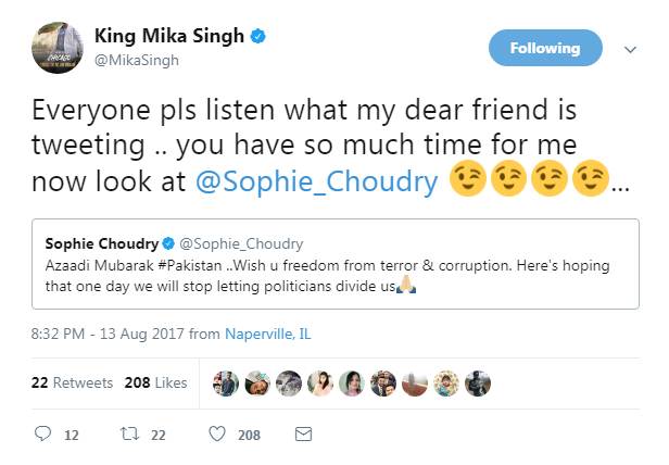 मीका सिंह ने सोफी चौधरी के इस ट्वीट को रिट्वीट करते हुए उन्हें ट्रोल करने की कोशिश की है। मीका सिंह का ट्वीट बताता है कि वो लोगों से कहना चाह रहे हैं कि जैसे पाकिस्तान को हमारा बताने पर मेरी निंदा की गई थी उसी तरह से सोफी का ये ट्वीट भी लोगों को देखना चाहिए।