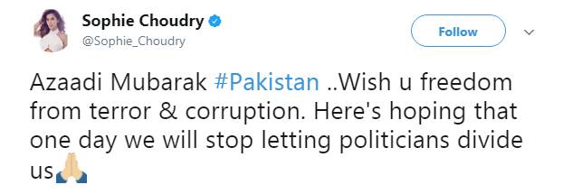 दरअसल सोफी चौधरी ने 14 अगस्त को पाकिस्तान के स्वतंत्रता दिवस पर पड़ोसी मुल्क को बधाई देते हुए ट्वीट किया है। सोफी ने अपने इस ट्वीट में लिखा- आजादी मुबारक पाकिस्तान, आप लोग आतंकवाद और भ्रष्टाचार से मुक्त हो मैं इसकी दुआ करती हूं। मैं आशा करती हूं कि एक दिन हम लोग इन नेताओं को हमें बांटने से रोकने में कामयाब हो सकेंगे।