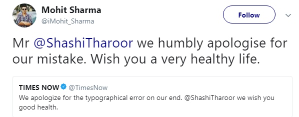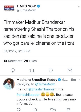 अपने दूसरे ट्वीट में उन्होंने लिखा कि मुझे लग रहा है कि मेरे शरीर का एक हिस्सा चला गया। एक अच्छा एक्टर, स्मार्ट, कॉस्मोपॉलिटन, हैंडसम और जिसके नाम और मेरे नाम में अकसर कंफ्यूजन हो जाता है। (मेरे ऑफिस में आज दो पत्रकारों ने तथाकथित खराब स्वास्थ्य के बारे में पूछा)। मैं शशि कपूर को याद करूंगा। हालांकि बाद में टाइम्स की ओर से शशि थरूर से माफी मांग ली गई। इसके जवाब में उन्होंने लिखा, कोई बात नहीं, गलतियां होती हैं। इस दुखद मौके पर मुस्कुराने का एक मौका मिला। वहीं चैनल ने फिल्म निर्माता मधुर भंडारकर की ओर से लिखा कि उन्होंने ‘शशि थरूर’ के निधन पर शोक जताया है और कहा कि वह एेसे निर्माता थे, जिन्होंने पैरलर सिनेमा को हमेशा आगे रखा।