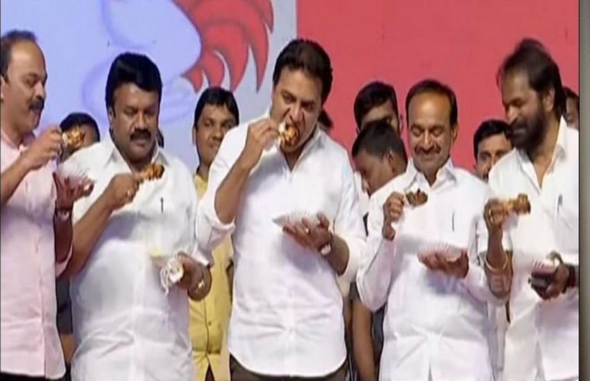 तेलंगाना में कोरोनावायरस के बारे में फैली अफवाहों को दूर करने के लिए केसीआर सरकार के मंत्रियों ने हैदराबाद में एक सार्वजनिक मंच पर जनता के सामने ही चिकेन खा कर दिखाया। दरअसल, मंत्री केटी रामाराव के नेतृत्व में मंत्रियों ने एक कार्यक्रम आयोजित किया था, इसका मकसद लोगों को यह बताना था कि कोरोनावायरस अंडे या चिकेन खाने से नहीं फैलता। इसी के तहत मंत्री केटी रामाराव, एतेला राजेंदर श्रीनिवास यादव और अन्य मंत्रियों ने मंच पर ही फ्राइड चिकेन खाया। इस कार्यक्रम की फोटो सोशल मीडिया पर वायरल हो रही हैं।