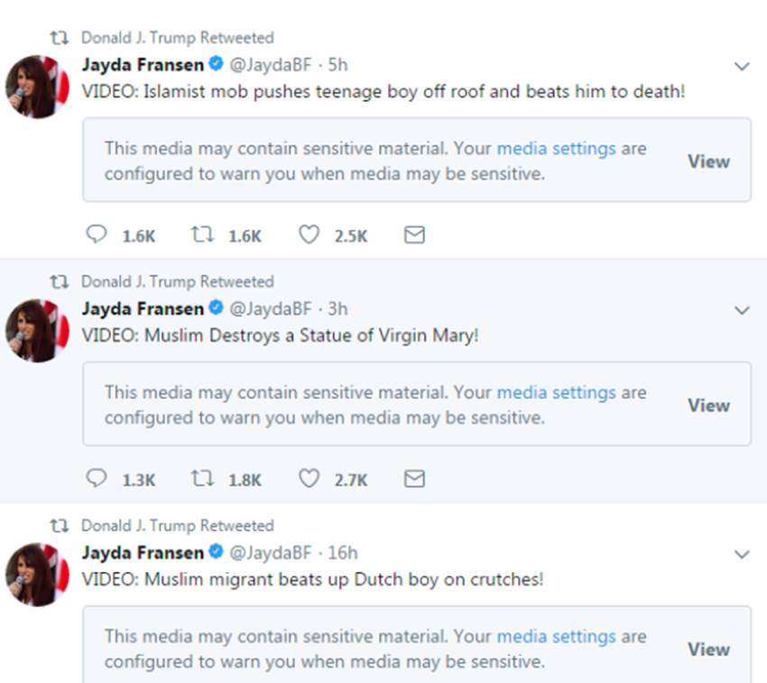 ट्रंप ने कहा कि यह विवाद अमेरिका में कोई बड़ी स्टोरी नहीं थी। उन्होंने कहा, “मैंने रिट्वीट किया क्योंकि मैं चरमपंथी इस्लामी आतंक का मुखर विरोधी हूं।” जिन वीडियो को ट्रंप ने ट्वीट किया था उनमें मुसलमानों को बुरे रूप में दिखाया गया था।