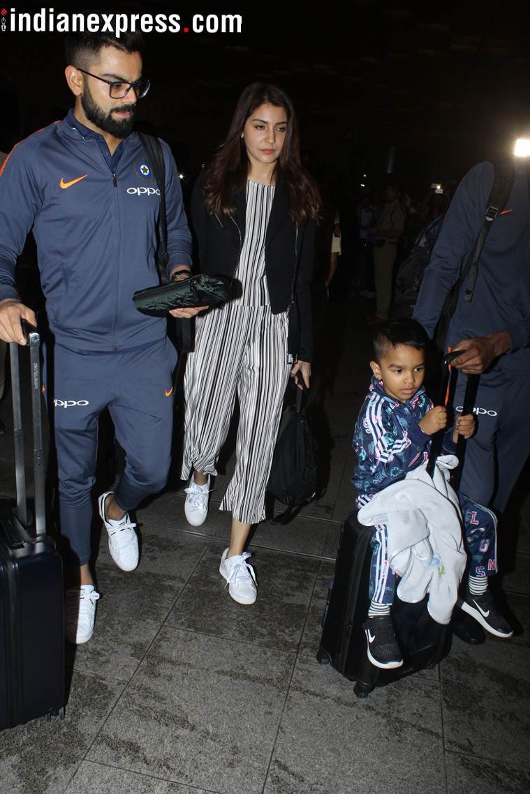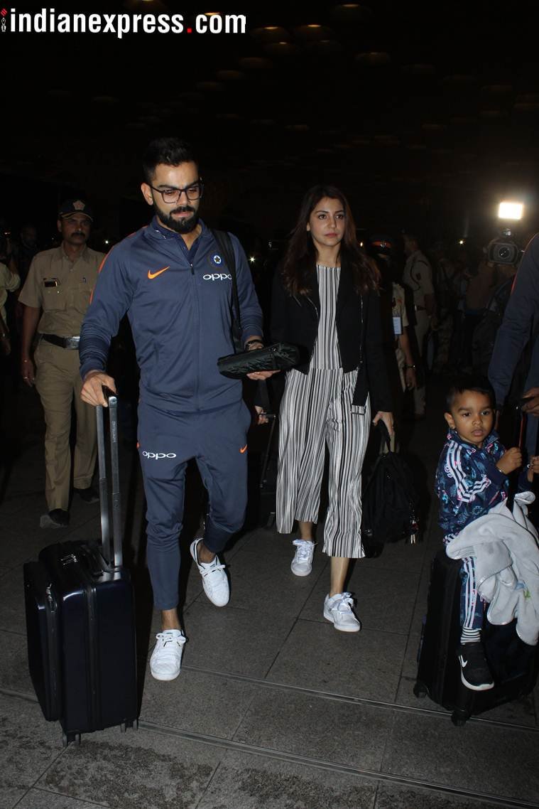 मुंबई में अपनी शादी का रिसेप्शन देने के बाद अनुष्का शर्मा और विराट कोहली बुधवार रात साउथ अफ्रीका के लिए निकल गए। एयरपोर्ट पहुंचे विराट और अनुष्का मीडिया के कैमरों से नहीं बच पाए। एयरपोर्ट पर जहां विराट नीले रंग के ट्रैक सूट में नजर आ रहे थे तो वहीं अनुष्का काले और सफेद रंग के जंप सूट में थीं। (Photo: Varinder Chawla)