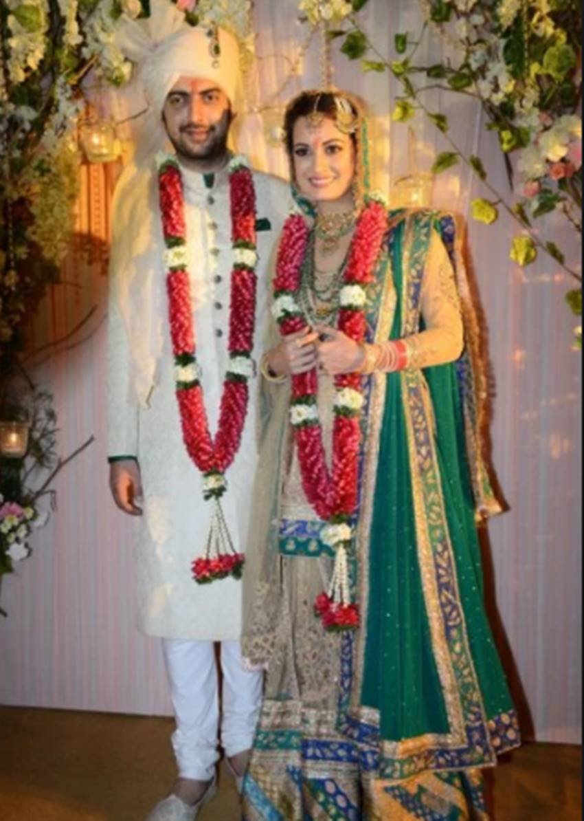 рджреАрдпрд╛ рдорд┐рд░реНрдЬрд╛ рдХреА рд╢рд╛рджреА рдлрд┐рд▓реНрдо рдореЗрдХрд░ рд╕рд╛рд╣рд┐рд▓ рд╕рдВрдШрд╛ рд╕реЗ рд╕рд╛рд▓ 2014 рдореЗрдВ рд╣реБрдИред рджреАрдпрд╛ рдиреЗ рдЕрдкрдиреА рд╢рд╛рджреА рдореЗрдВ рдЧреНрд░реАрди рдФрд░ рдЧреЛрд▓реНрдб рдХрд▓рд░ рдХрд╛ рд▓рд╣рдВрдЧрд╛ рдкрд╣рдирд╛ рдЬрд┐рд╕реЗ рд░рд┐рддреВ рдХреБрдорд╛рд░ рдиреЗ рдбрд┐рдЬрд╛рдЗрди рдХрд┐рдпрд╛ рдерд╛ред -