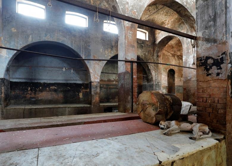 लखनऊ के बंद पड़े मटन मार्केट के अंदर से गुजरता एक शख्स । REUTERS/Pawan Kumar