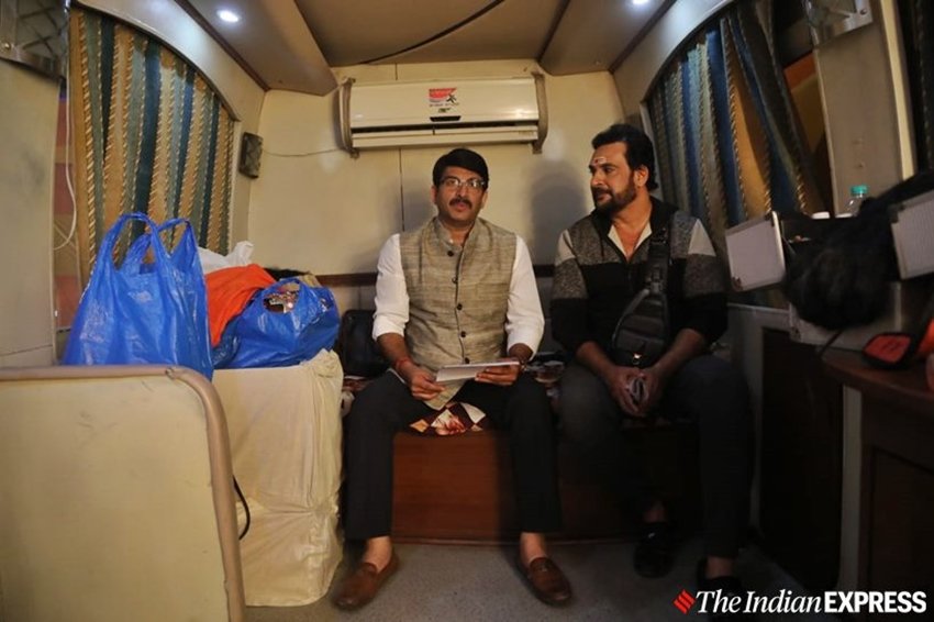 अपनी वैनिटी वैन में बॉलीवुड एक्टर शाहबाज खान के साथ बैठ अपने डायलॉग्स पढ़ते मनोज तिवारी। शाहबाज रामलीला में रावण का किरदार निभा रहे हैं। -