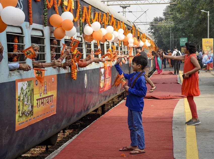 दिल्ली के सफरदर रेलवे स्टेशन पर बुधवार को कहीं भगवान श्रीराम ट्रेन के गेट पर खड़े दिखाई दिए तो कहीं लक्ष्मण मूर्छित पड़े दिखे कहीं वानर सेना तो कहीं श्रीराम के नारे सुनाई दिए। मौका था रामायण एक्सप्रेस की रवानगी का। 14 नवंबर को सफदरजंग स्टेशन से रामायण एक्सप्रेस को हरी झंडी दी गई। इस ट्रेन के द्वारा यात्री श्रीराम से जुड़े तीर्थ स्थानों की यात्रा कर सकते हैं। यह ट्रेन भारत में यात्रियों को अयोध्या, नंदीग्राम, सीतामढ़ी, जनकपुर, वाराणसी, प्रयाग, श्रृंगपुर, चित्रकूट, नासिक, हंपी, और रामेश्वरम की सैर करवाएगी। रवानगी के पहले दिन सफदरजंग स्टेशन पर राजस्थान, हरियाणा, गुजरात और उत्तर प्रदेश के यात्री नजर आए। इनके अलावा तमाम बीजेपी कार्यकर्ता भी दिखे। (All pics- PTI)